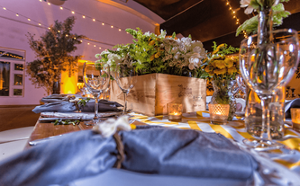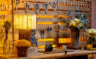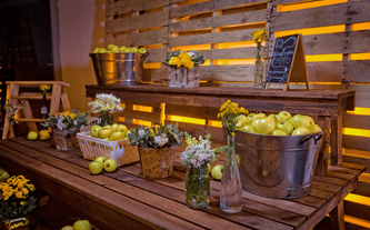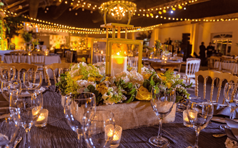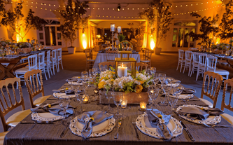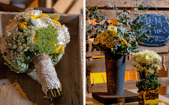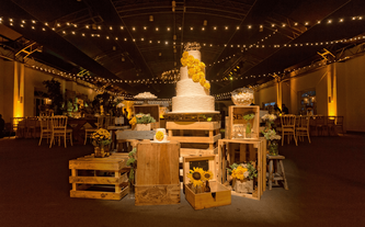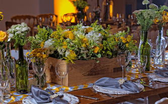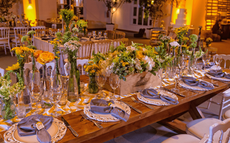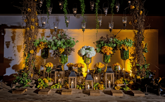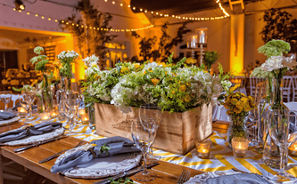Foto: Otto Winter Iluminación: Vialx Bizcocho: Rosario Hernández Pastelería Fina Denise y Máximo son una pareja muy sencilla y romántica. Desde que Denise nos contactó y mostró las fotos que reflejaban la idea que tenía de su boda, los colores y el ambiente, quedamos enamorados de este proyecto. Su pasión por lo rústico, el amarillo con la ele-gancia del gris, la sencillez de las flores silvestres y los detalles estaban claramente definidos. A Denise le encantaban las paletas de carga, las botellitas en miniatura de coca cola, las pizarritas y todas las chulerías que veía cada día en Pinterest. Inspirados en todos esos detalles diseñamos una boda de estilo country pero con la elegancia de realizarla dentro de un salón como el Garden Tent. Los bombillitos cruzaban de lado a lado en forma asimétrica para proyectar lo casual del ambiente, las mesas en madera tipo picnic con combinación de sillas, los centros en lanterns amarillos, cajones de vino con ores silvestres y botellas con detalles de girasoles y flores exóticas. |