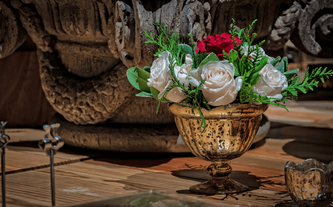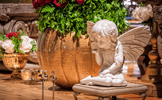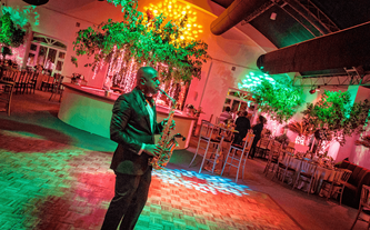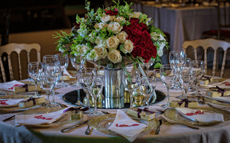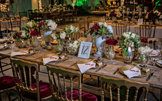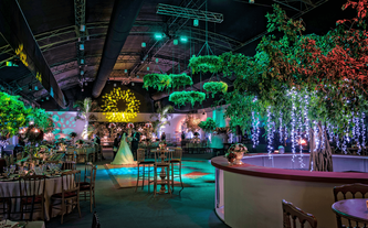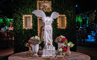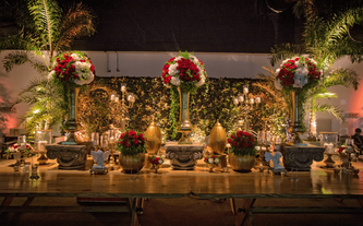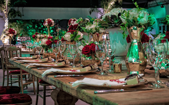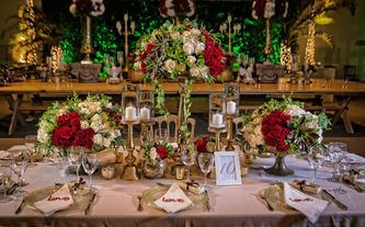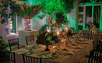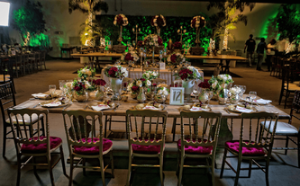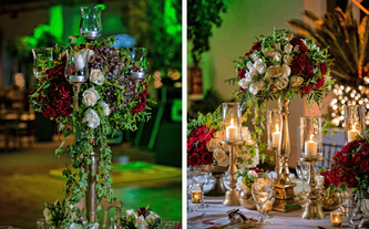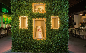 A Ana Carolina le encanta el color vino, su color preferido. Quería combinar la elegancia de este color sobrio con el verdor de la naturaleza llena de lucecitas románticas. Así creamos un ambiente poblado de plantas dentro del Garden Tent, con combinaciones de laureles y palmas ambientadas en jardines alrededor de todo el salón.